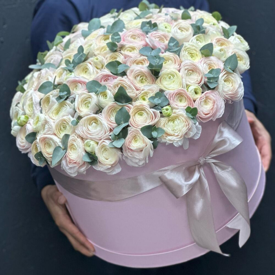 На фото 101 белый ранункулюс в коробке. В составе: ранункулюс 101 шт, оазис флористический 2 шт, шляпная коробка (xl) 1 шт, . Все цветы свежие и ароматные, букет красиво оформлен и отлично подходит для подарка. Доступна доставка цветов или самовывоз.